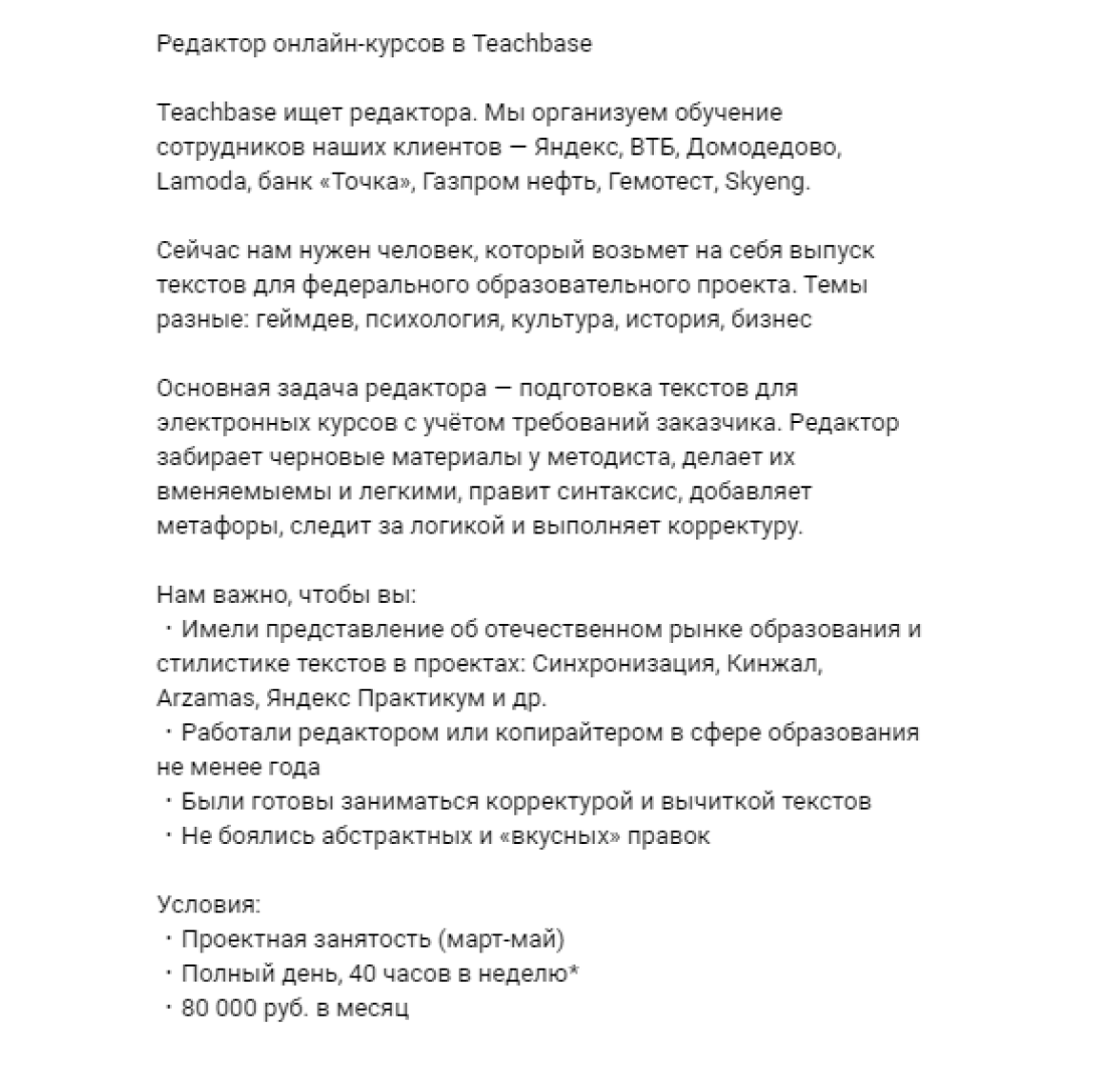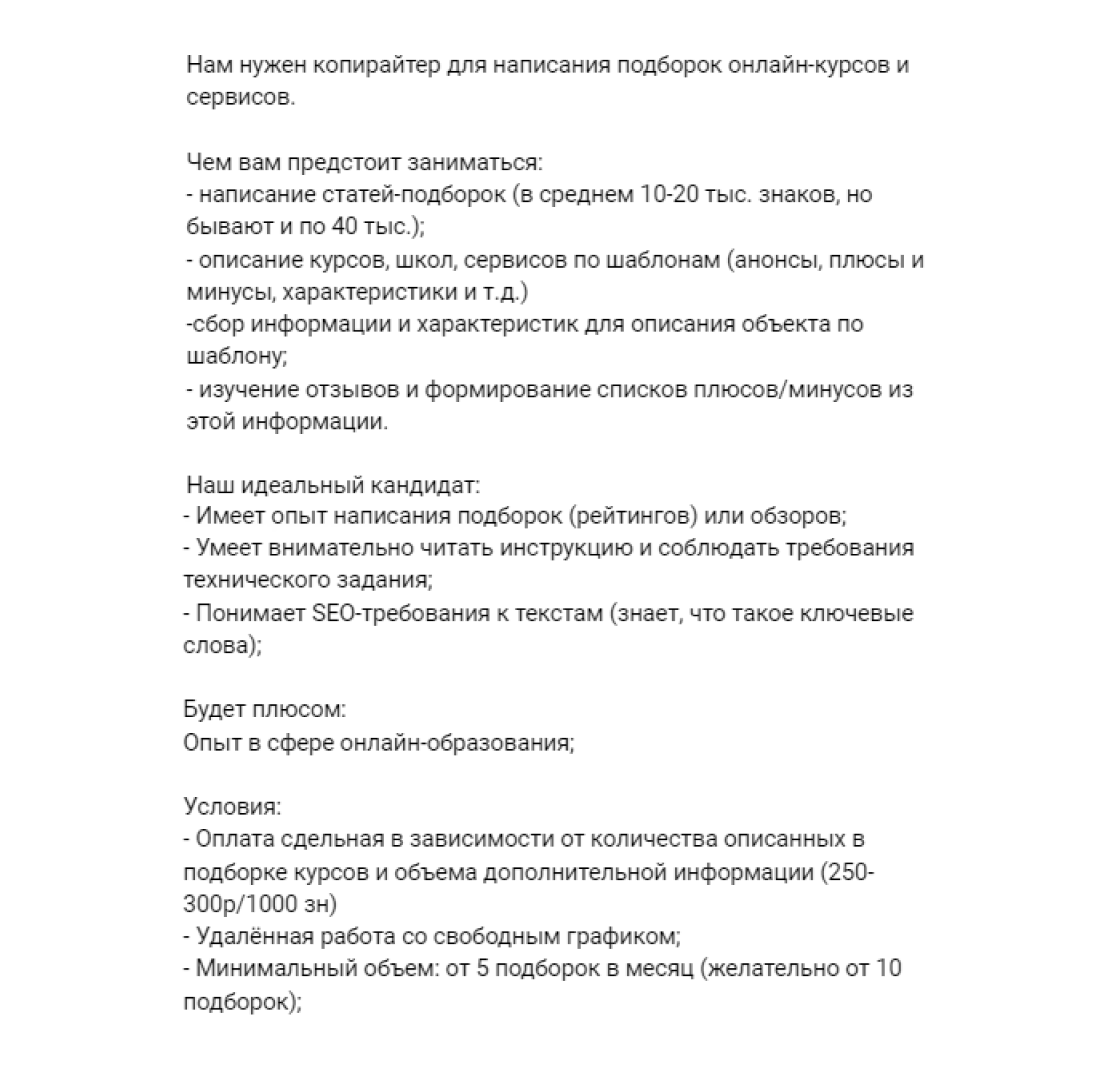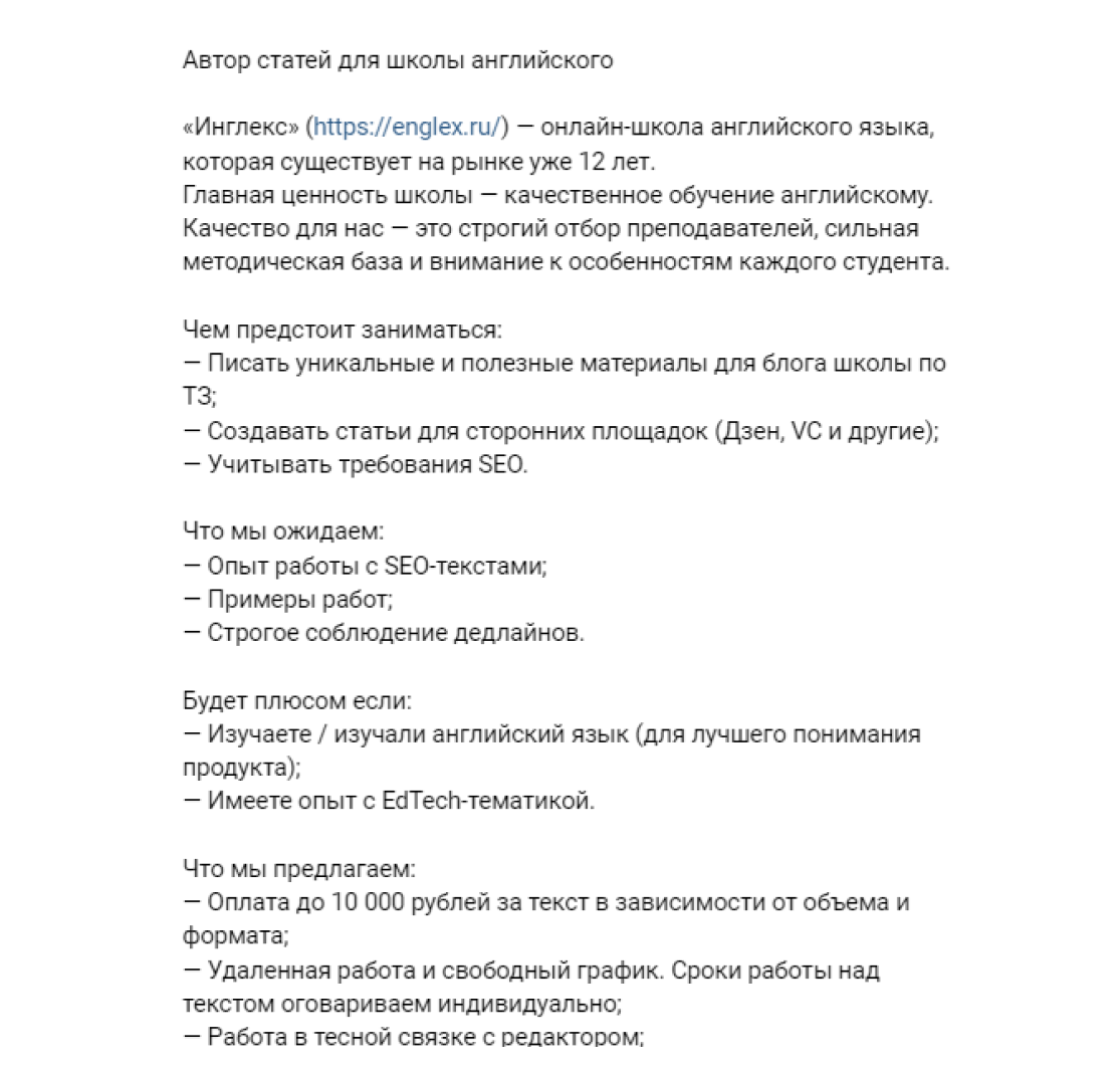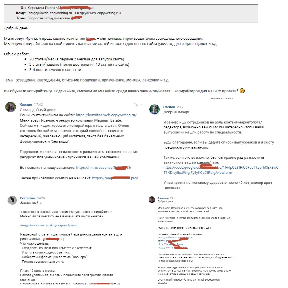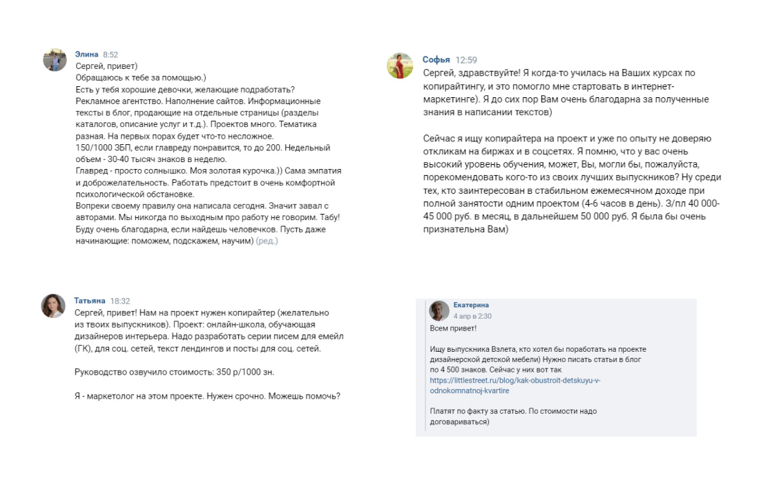 У нашей школы хорошая репутация, поэтому периодически мы получаем и прямые запросы на копирайтеров.